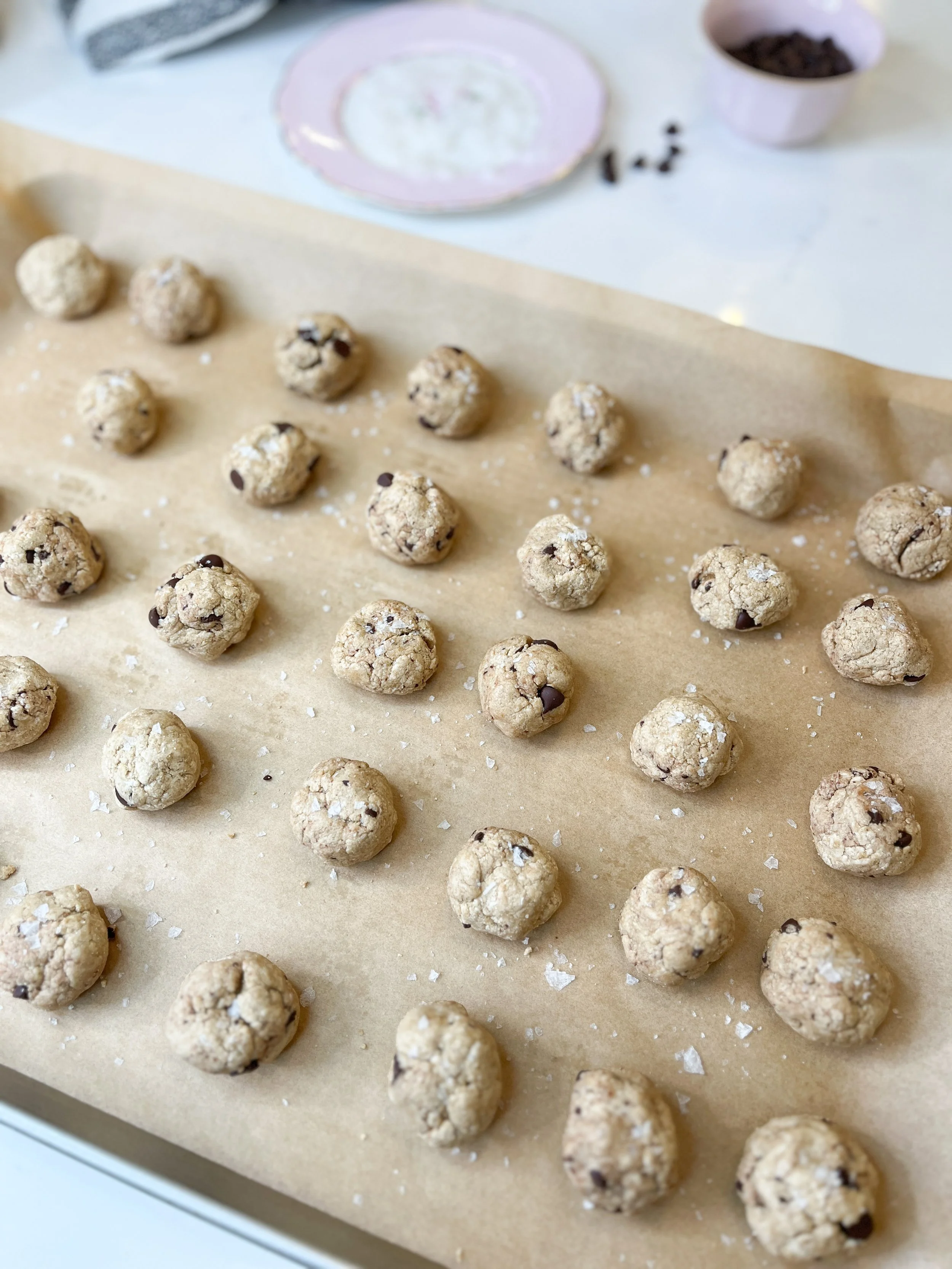 Roll into bite size balls using your hands & place on a cookie sheet lined with parchment. Sprinkle with the Maldon salt if using.