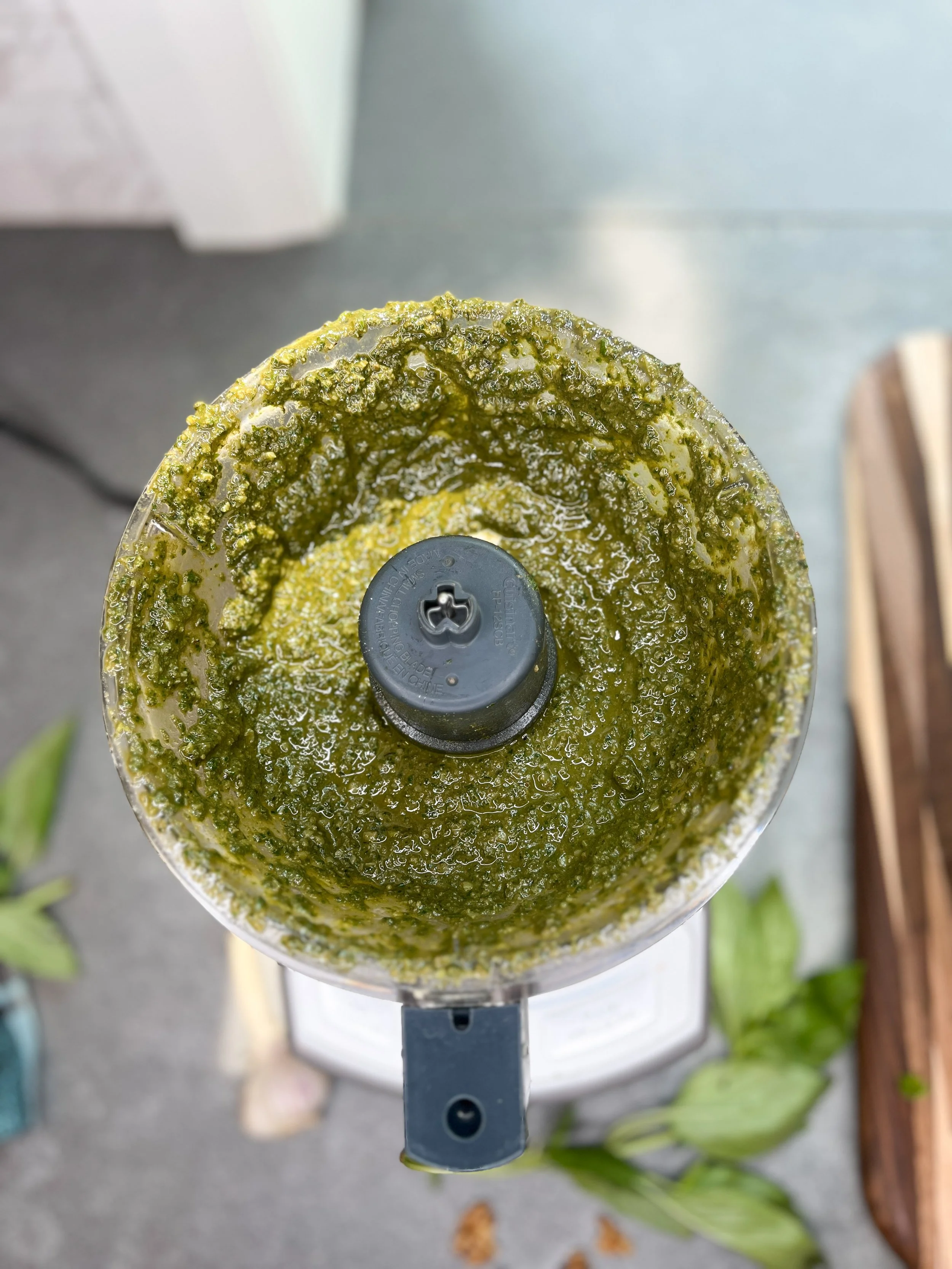And here’s the good news: you can help to reduce your risk by prioritizing anti-inflammatory whole foods that are rich in antioxidants. And one of my favourite ways to get in 2 antioxidant superfoods is to make pesto! Grab fresh basil from your local market this weekend and set aside 5 minutes to whip up a batch, this is SO cost-effective when you make it in the summer, when basil is in season. This sauce freezes beautifully, so I recommend doubling the recipe so you can enjoy fresh basil year-round.